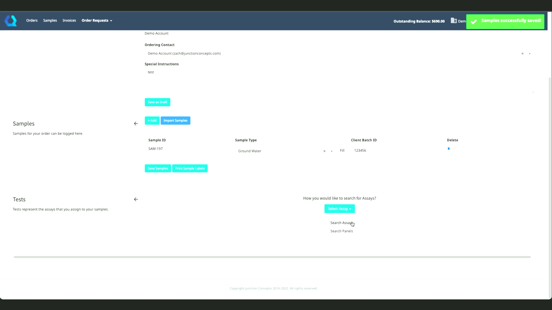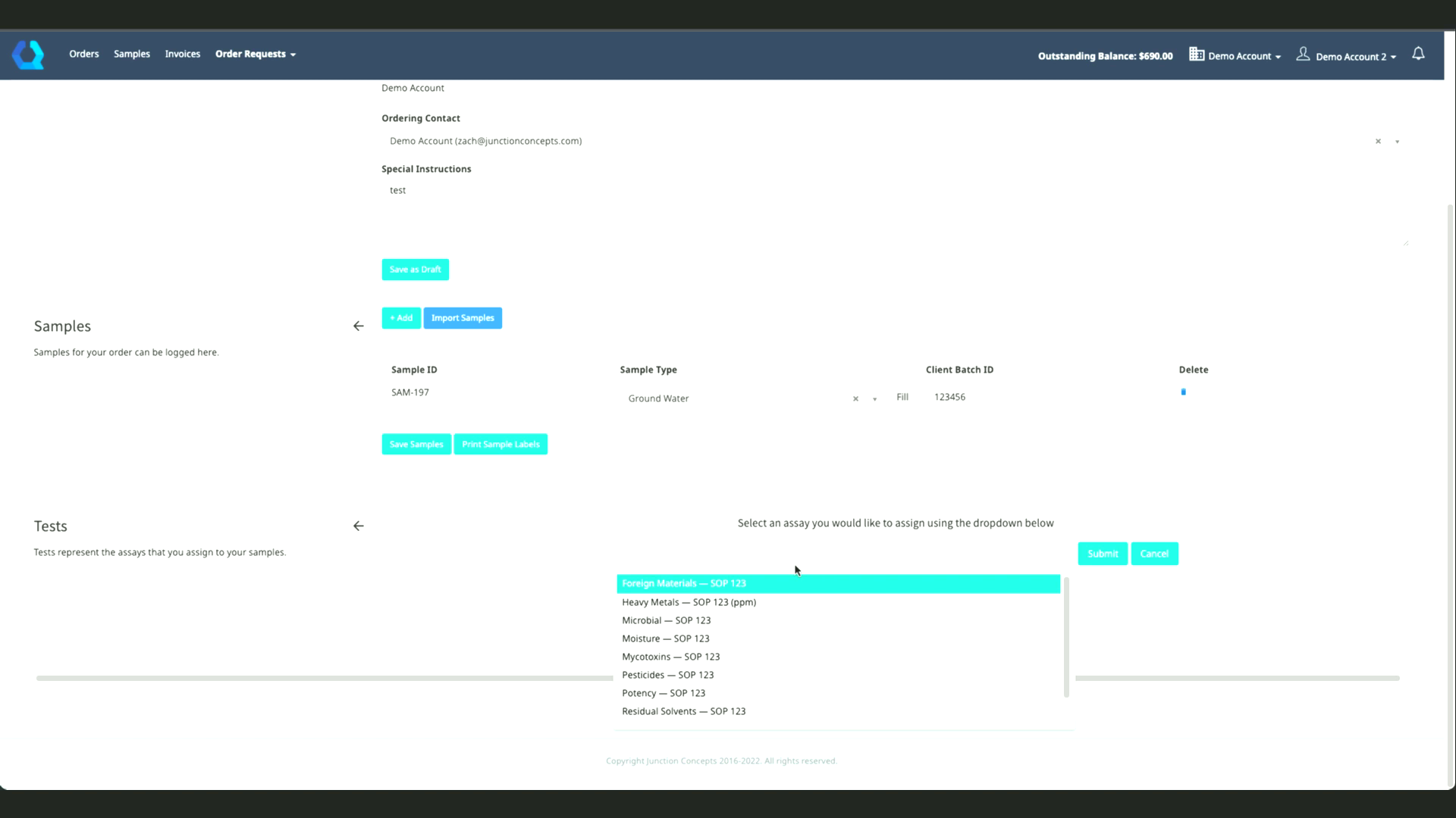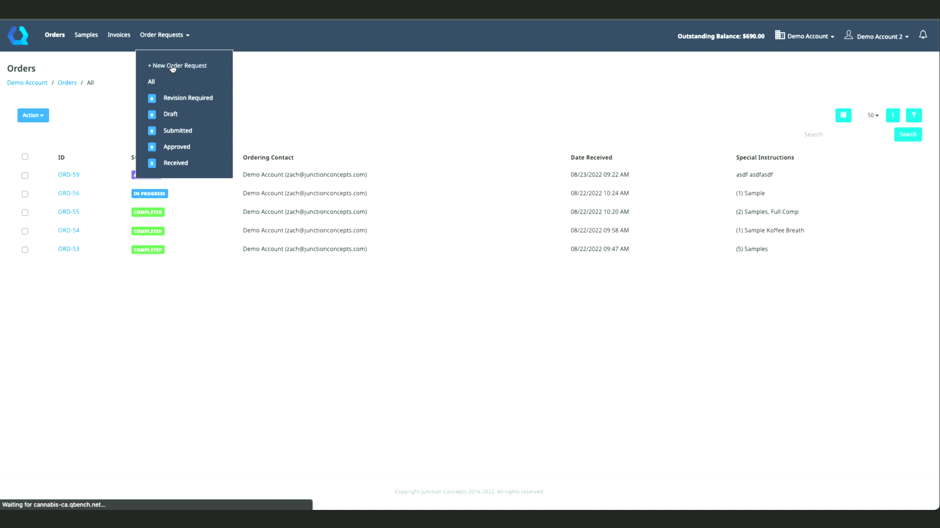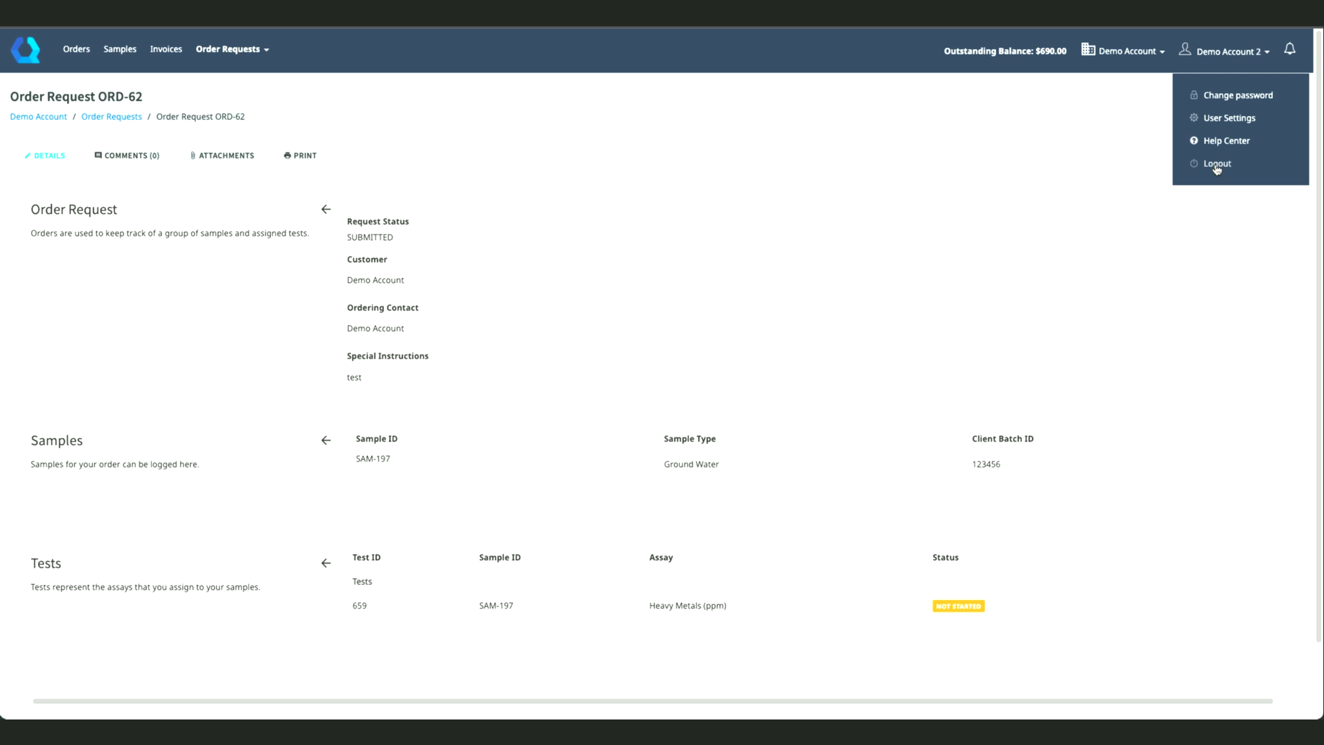 To start this process, an order needs to be placed within Qbench. This can be done either by the app in LIMS or by a customer from the Customer Portal. I'll start in the Customer Portal as a customer.