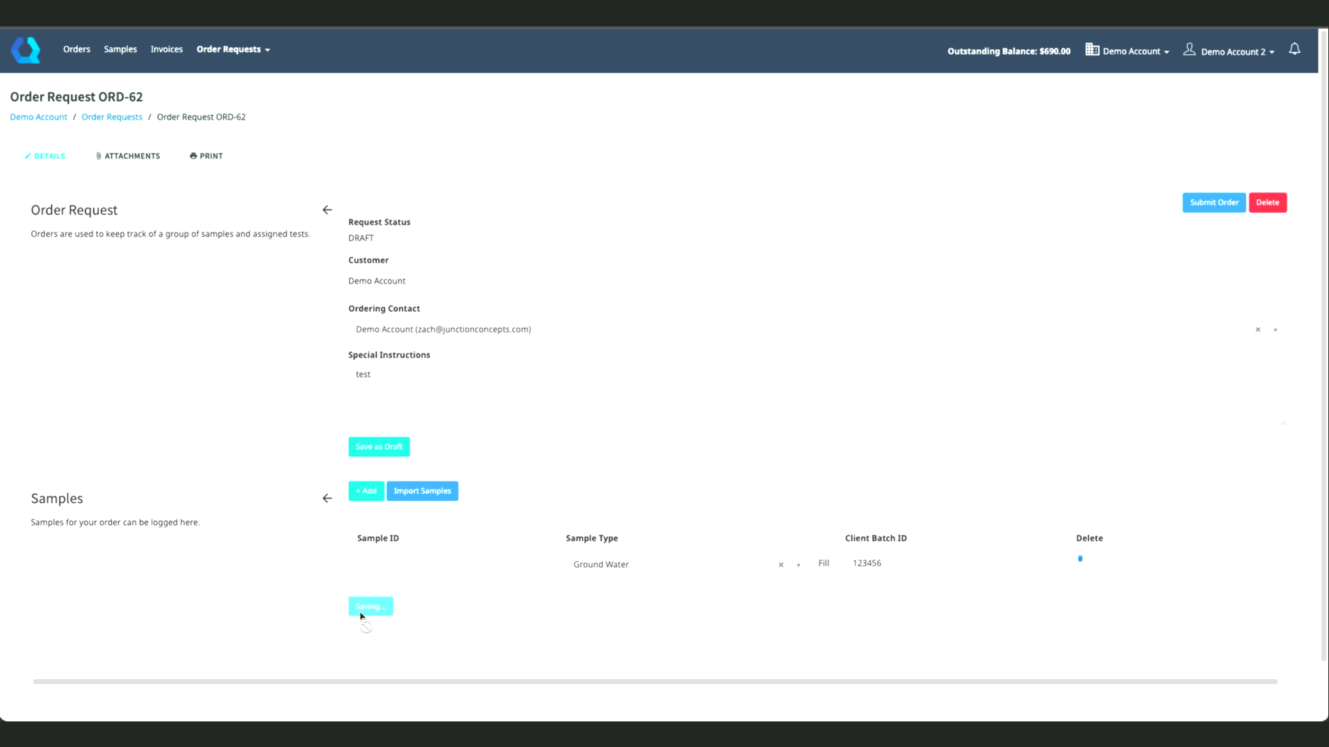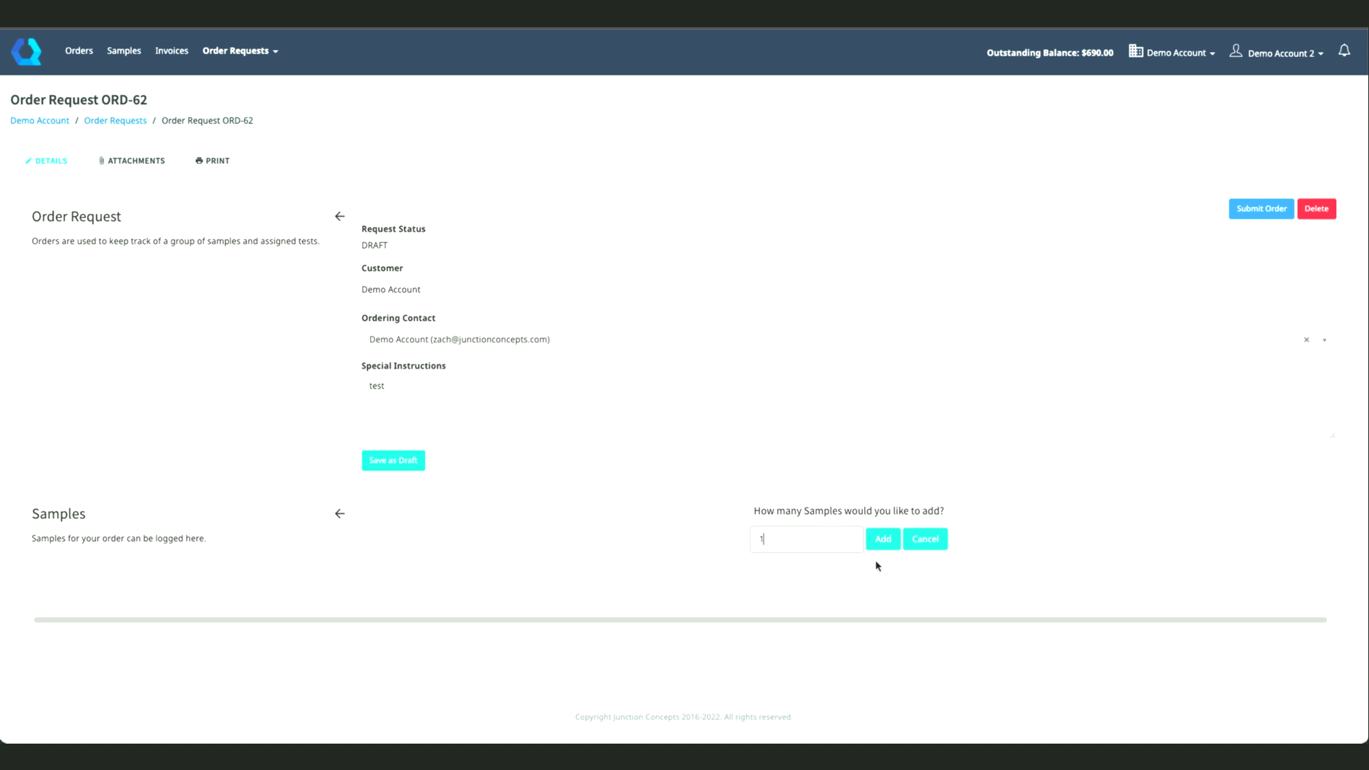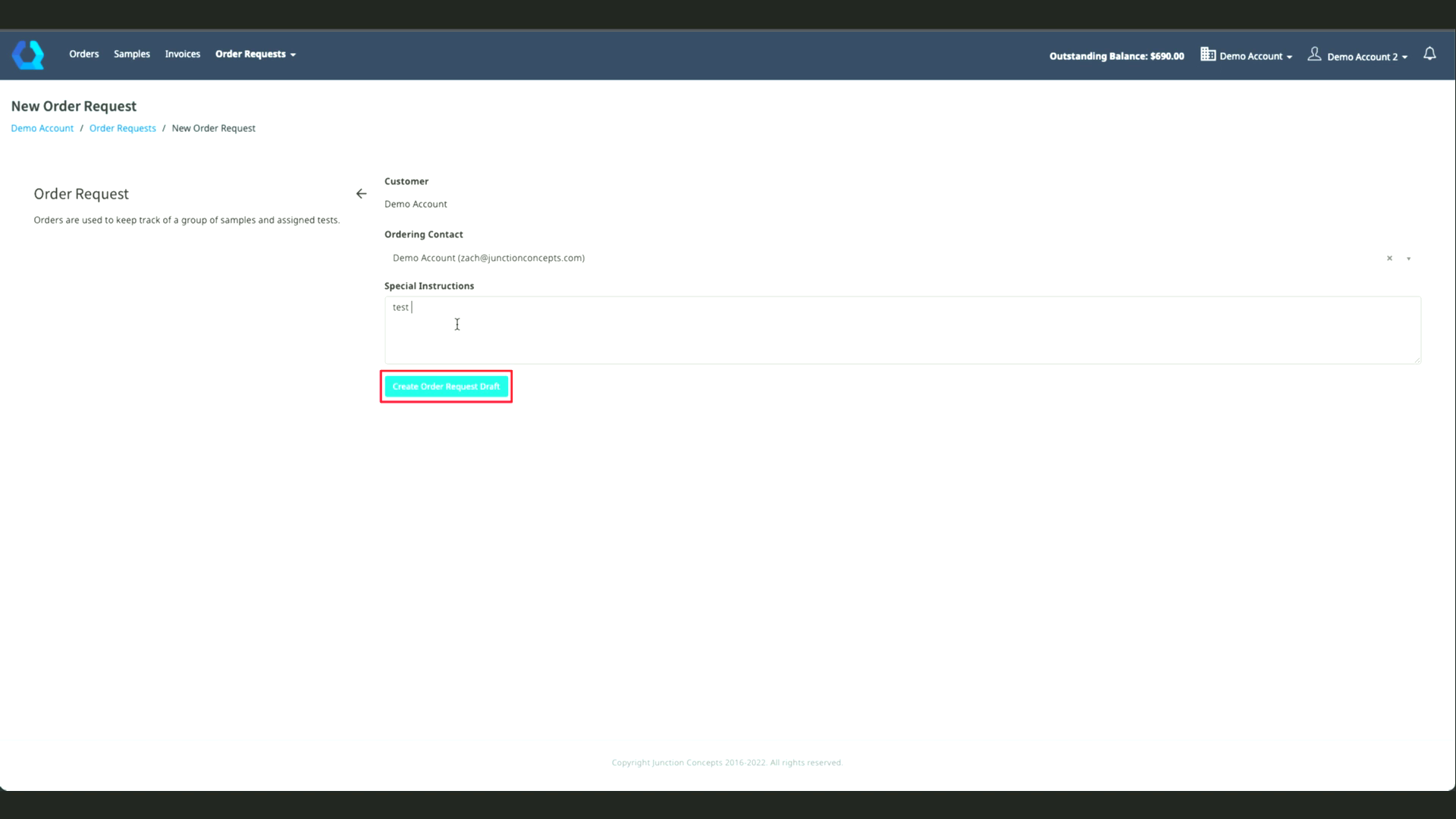 My Qbench Order screen may look different than yours. Enter all order related required fields and click Create Order Request draft.