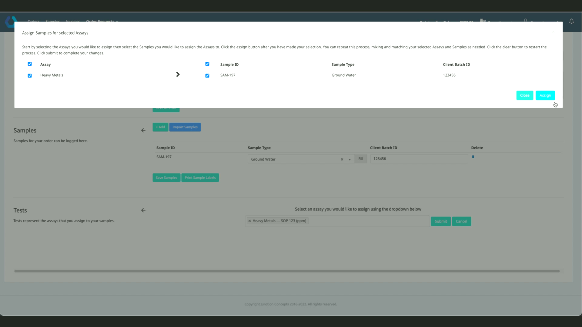 Lastly, I'll need to add a test or tests to this sample. Click assign assays. Choose between an individual assay or test or a panel, which is a grouping of tests.