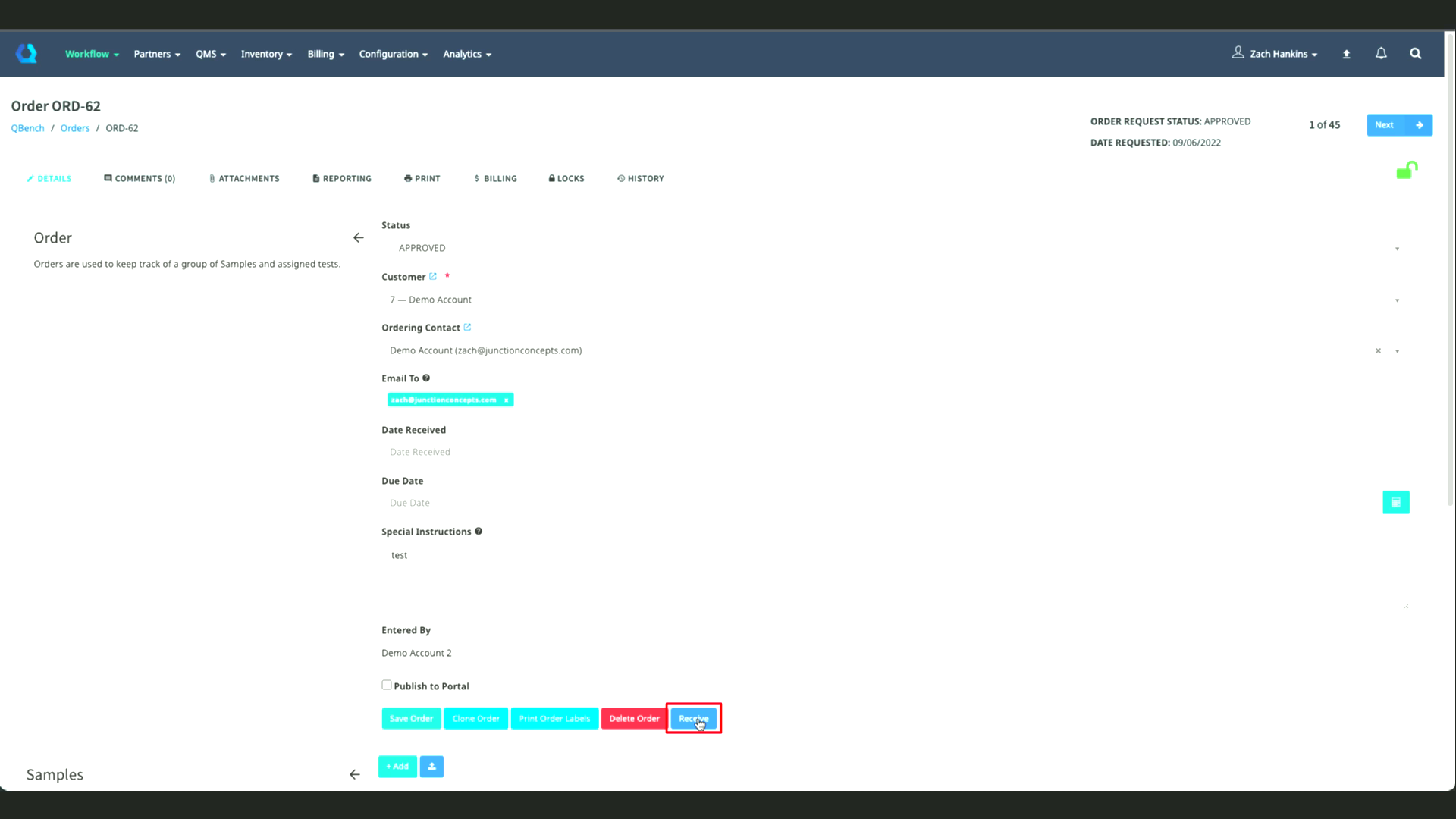 Once samples officially arrive in the lab, select the Blue Receive button.