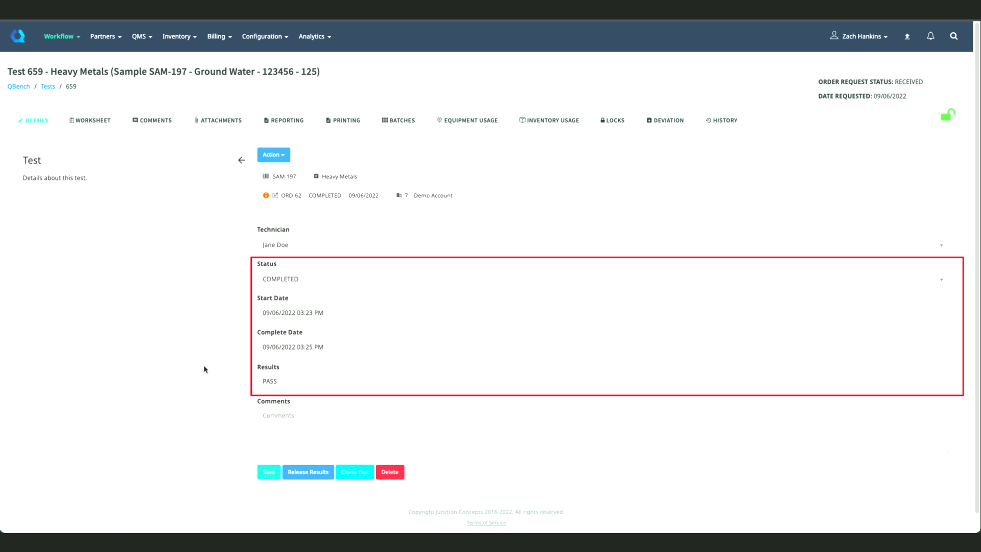 Upon Saving, you can see my status automatically update to Completed along with the complete date being populated as well as the overall results field, this sample is now ready to be reviewed and reported on.