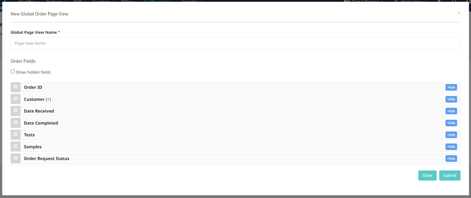 - The Edit Global Order Page View gives you the option to edit the view you have created. You can hide and show fields and edit the name.