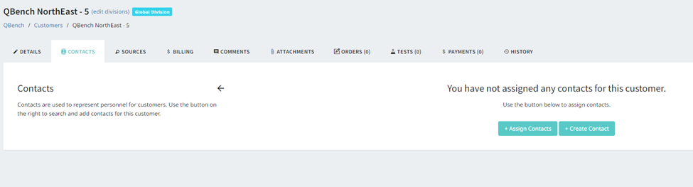 - Tests- Clicking this tab takes you to a separate page of all the Tests attached to the Customer & contact.