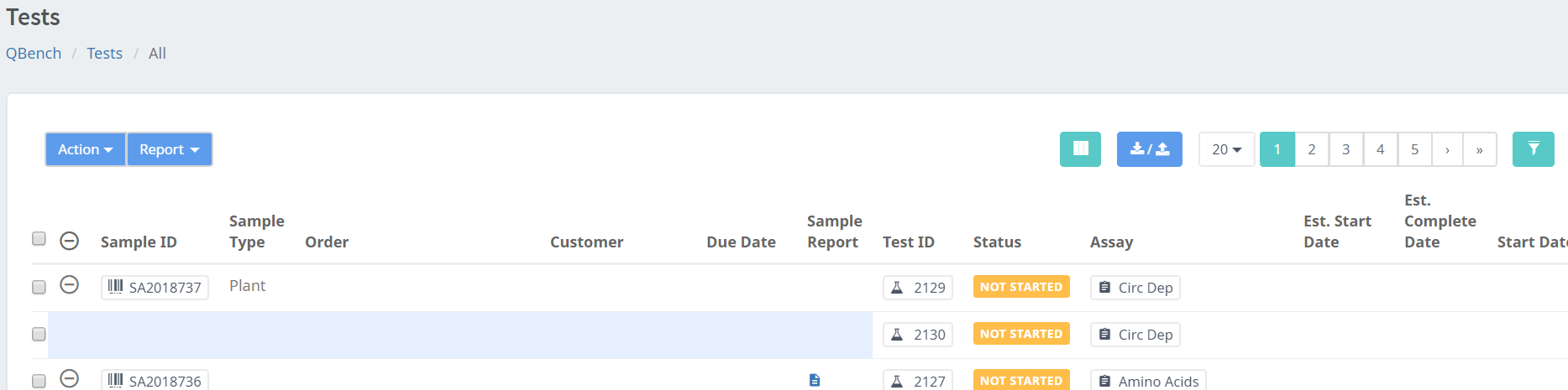 - Under the All page for tests, you see the overview of samples, customers and orders.