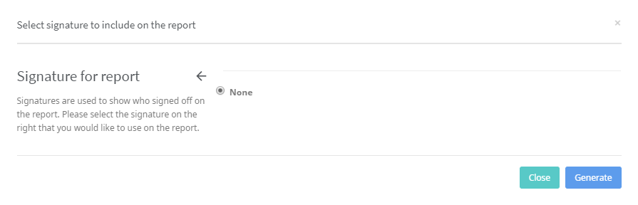 - A new window will pop up and ask if you wish to add a signature to the report or not. (See also User Settings.) After this, click Generate once more, and a Certificate of Analysis (CoA) will be generated.