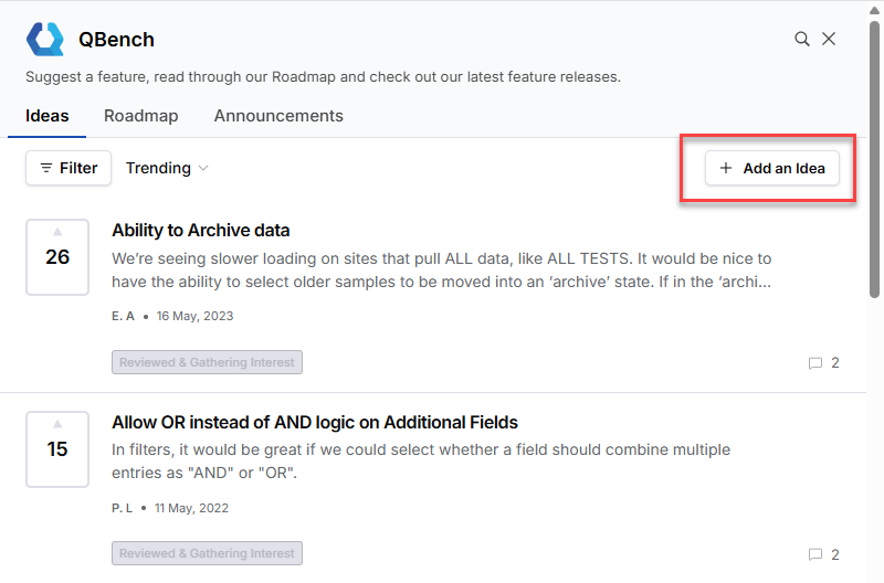 A widget will popout from the right side of the screen. Click on Add an Idea.