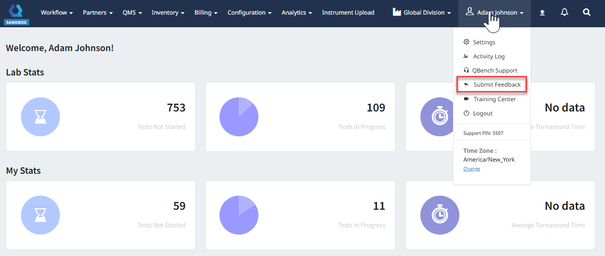 Click on your name to open a menu, and select Submit Feedback.
