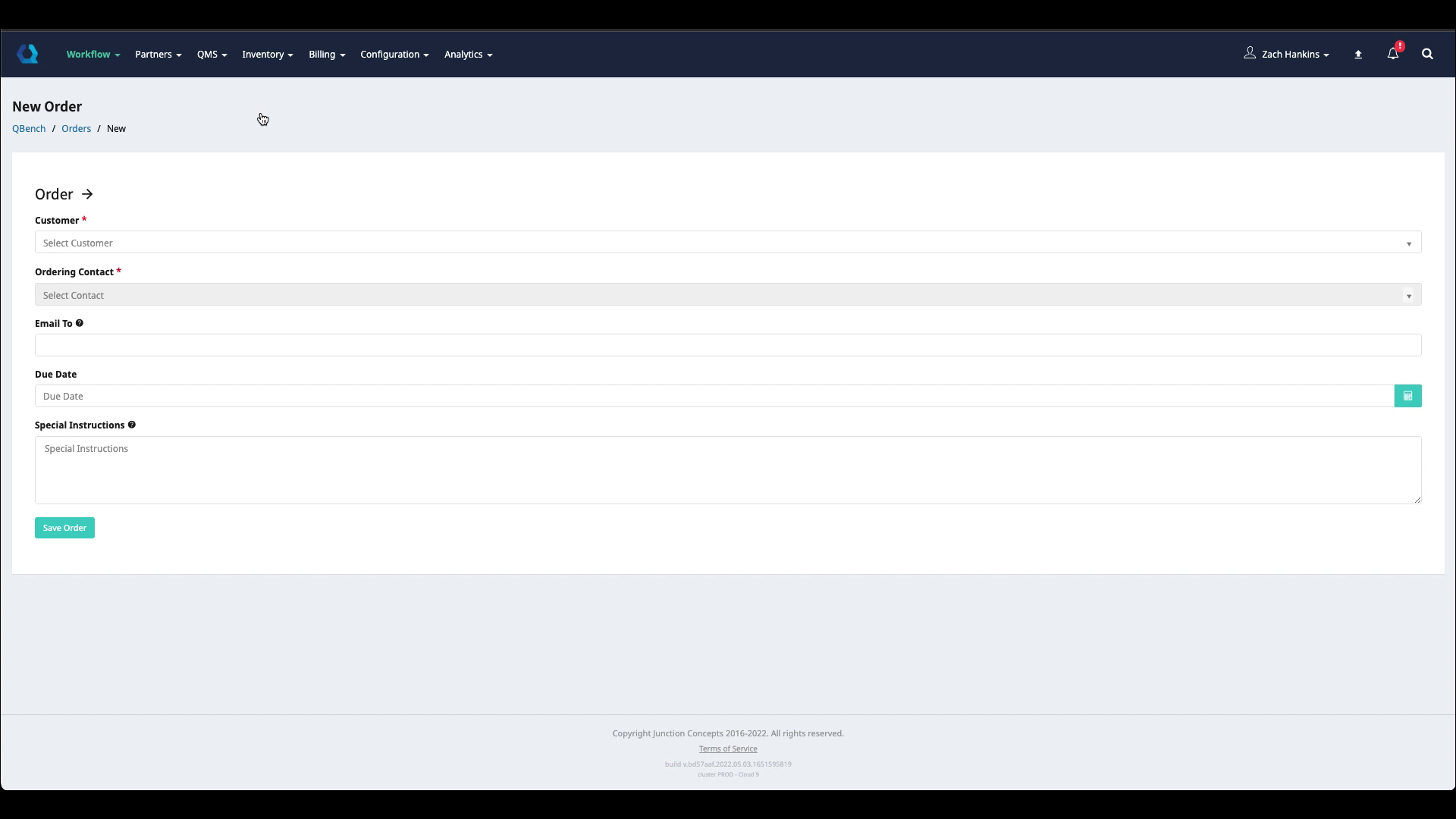 Each order has a list of fields created by the LIMS administrator. Fill out the required Customer and Ordering Contact fields, and add emails, due dates, and special instructions - where applicable.