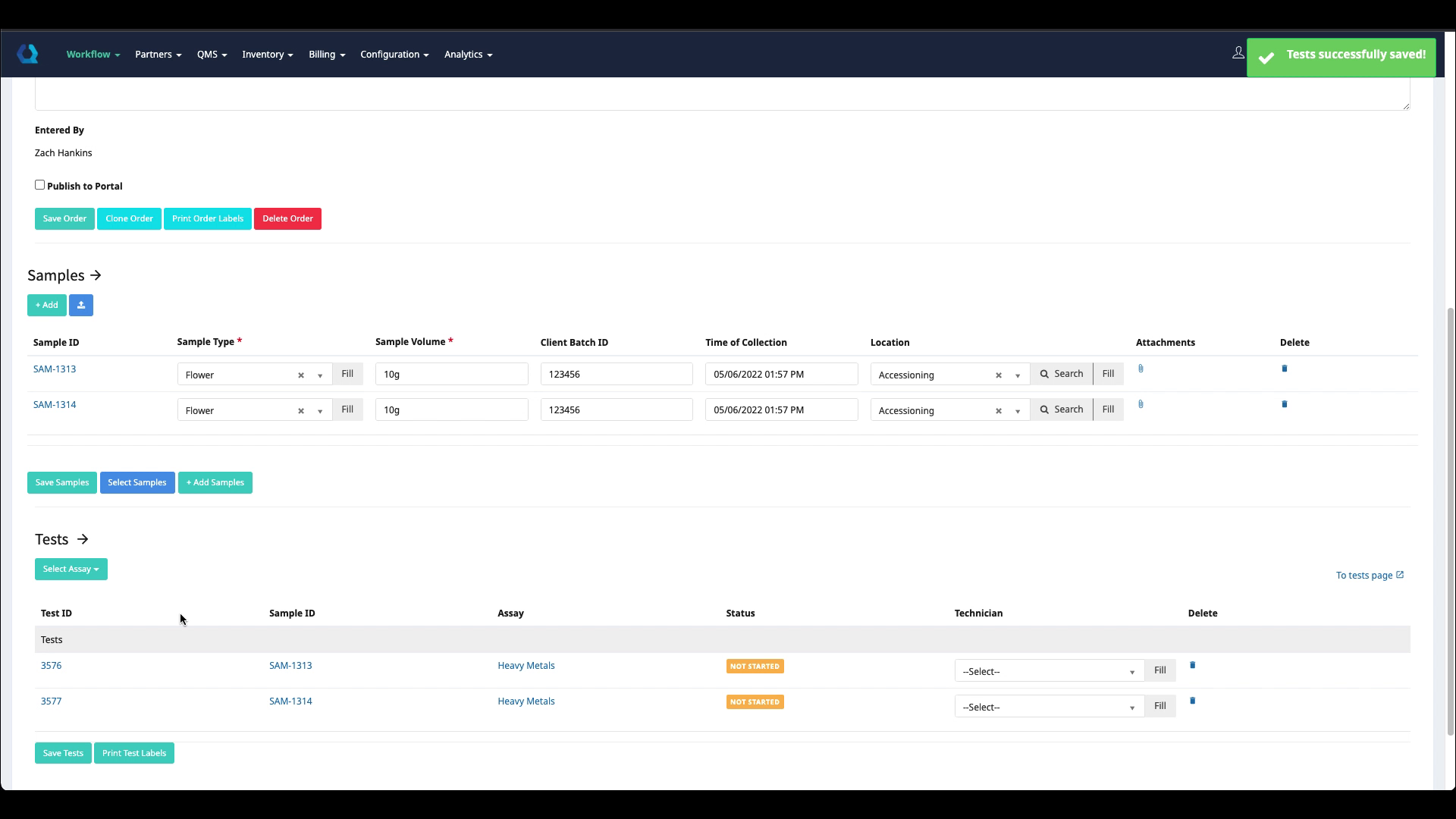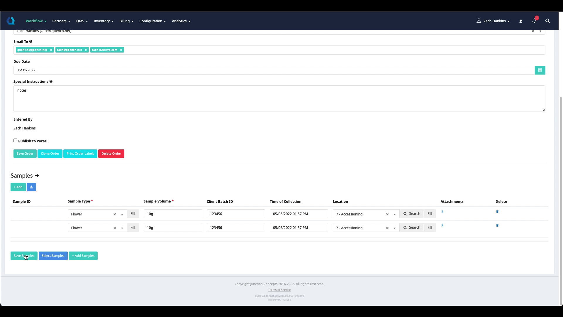You will see a list of fields your LIMS admin has created, you will need to fill out. Once you have done so, select Save Samples.