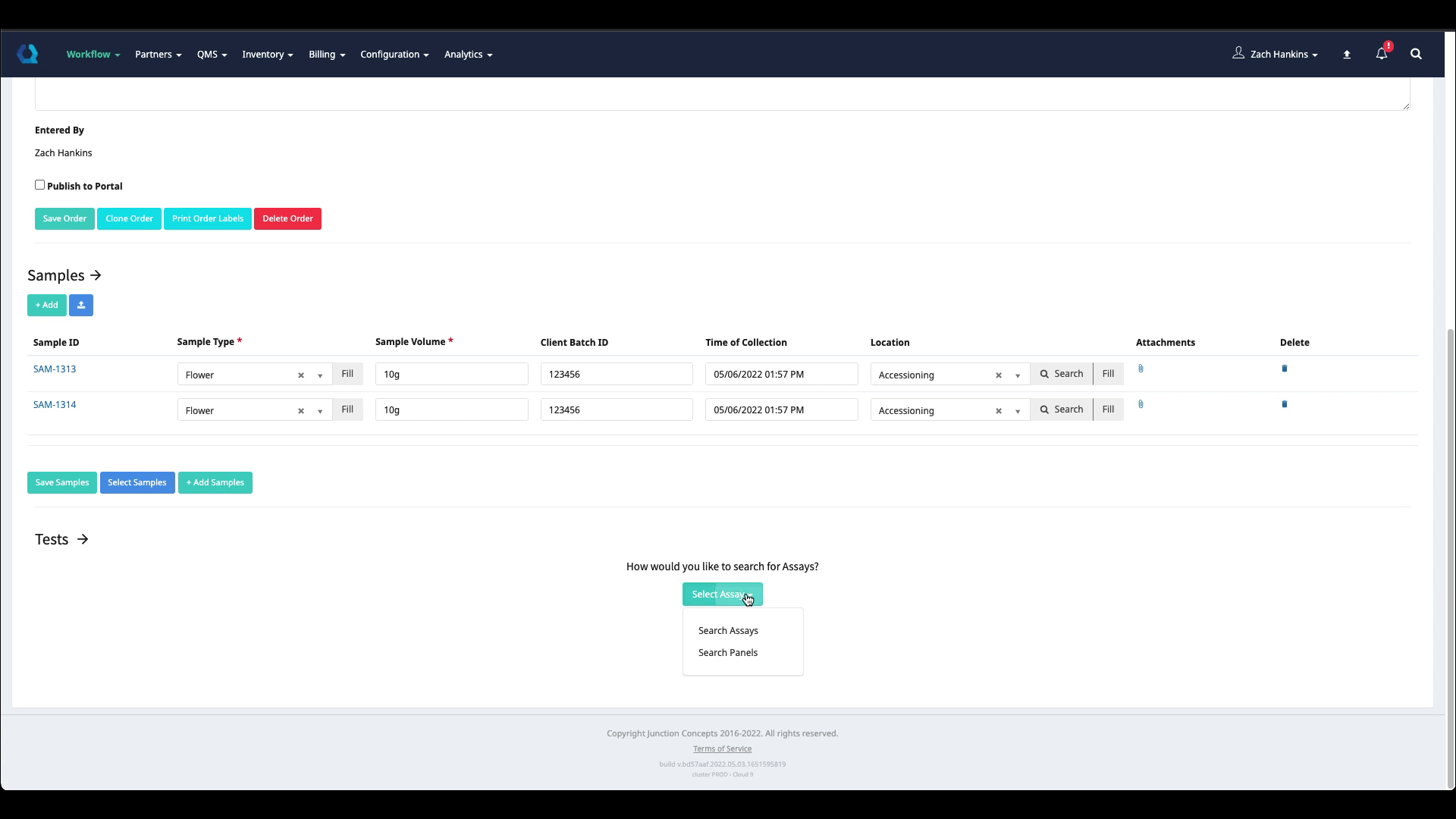 Now that you have assigned samples, you will want to assign tests. Click on Select Assay. You may choose an individual Assay or a Panel (a group of Assays)